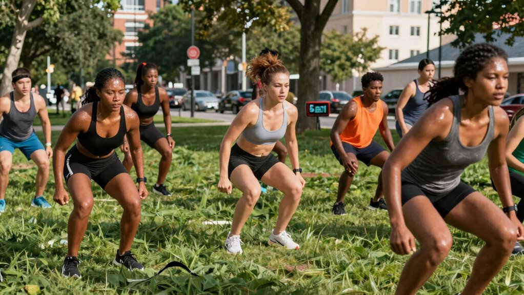 Before diving into HIIT, it’s vital to make certain you’re prepared to maximize both safety and effectiveness. Start with proper warm-up techniques to get your body ready for intense intervals. Dynamic stretches, like leg swings and arm circles, can increase blood flow and flexibility. Once you finish your HIIT session, don’t skip your cooldown strategies. Gradually lower your heart rate with light jogging or walking, followed by static stretches to help ease muscle tension. Additionally, listen to your body and adjust the intensity as needed. It’s essential to stay hydrated and guarantee you have the right gear, like supportive shoes. Incorporating proper warm-up routines can also help prevent injuries and improve workout performance. Incorporating accountability strategies can also help maintain consistency and motivation in your workout routine. By following these tips, you’ll set yourself up for a safe and successful HIIT experience.