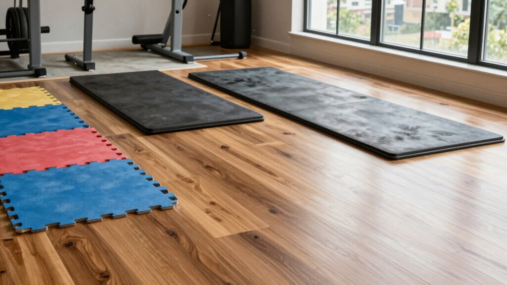 When you’re setting up your home gym, choosing the right flooring can make all the difference in your workout experience. The flooring impact on your body and your performance is significant. Proper flooring can enhance your workout efficiency by providing the right amount of grip and support. If you opt for hard surfaces, you may find that your joints suffer, leading to discomfort and decreased performance. On the other hand, a soft, cushioned floor can absorb impact, reducing strain during high-impact exercises. Additionally, the right flooring can help you maintain your balance and stability, allowing you to push yourself further in your workouts. Ultimately, selecting the appropriate flooring sets the foundation for a successful and enjoyable fitness journey. Choosing the right flooring material is essential to ensure durability and safety during your routines.