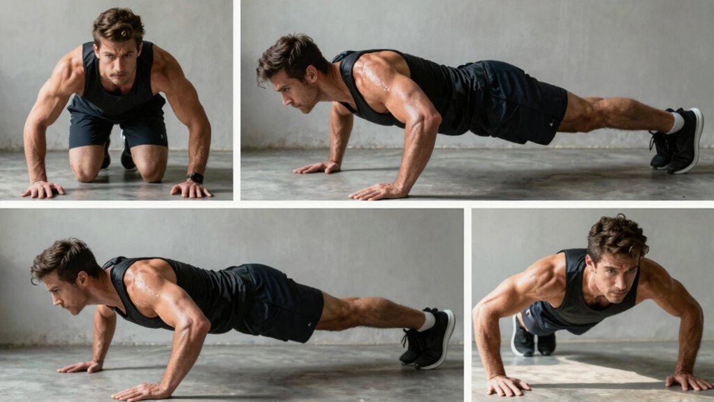 As you build strength with standard push-ups, incorporating challenging variations can elevate your workout and target different muscle groups. Try explosive push-ups for a power boost; they’ll engage your chest and triceps while improving your overall explosiveness. Diamond push-ups will focus on your triceps, giving them a solid workout. Decline push-ups shift the emphasis to your upper chest, enhancing your strength. For an impressive twist, clapping push-ups challenge your coordination and upper body power. One-arm push-ups require stability and strength, pushing your limits further. Finally, spiderman push-ups not only work your chest and triceps but also engage your core, providing a full-body challenge. Mix these variations into your routine for a well-rounded strength-building experience.