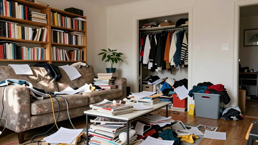 Your childhood environment shapes your clutter habits through childhood memories and parenting styles. If you grew up in a cluttered space with lax rules, you might see mess as normal and struggle with tidiness. Conversely, strict parenting and organized routines foster good habits. These early experiences influence how you handle clutter today, making it essential to recognize and address these influences for better organization and a clutter-free home.