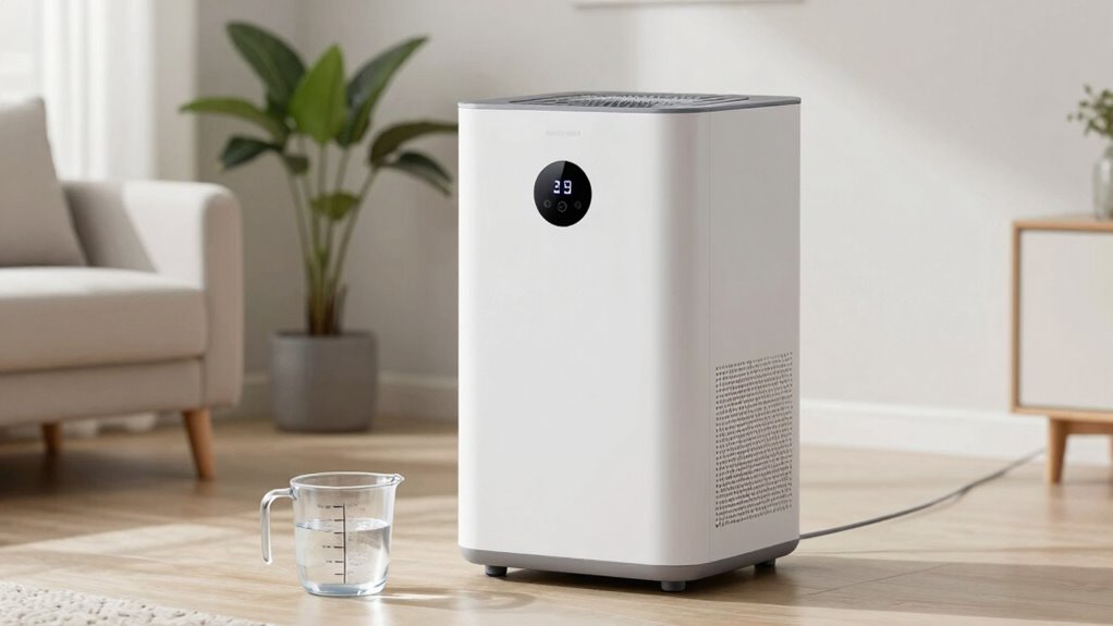 To convert dehumidifier capacity from pints to liters, multiply the pint value by 0.473. For example, a 50-pint dehumidifier extracts about 23.65 liters of moisture daily. This conversion helps you compare humidity levels and moisture extraction efficiency across units. When choosing a dehumidifier, understanding capacity in liters guarantees you select the right size for your space’s humidity control needs.