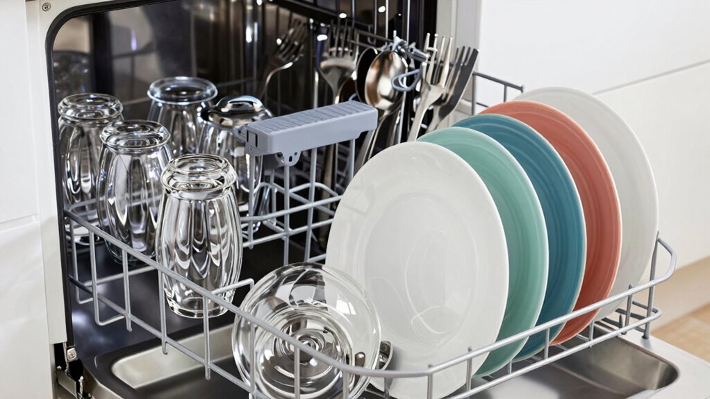 Did you know that ceramic and tempered glass are among the top dishwasher-safe materials? You should select durable materials like stainless steel and high-quality plastics for your dishes, as they withstand high temperatures and strong water jets without warping or cracking. These dishwasher-safe options ensure your dishes stay in good shape, making your cleaning routine easier and more efficient while protecting your investment in quality dinnerware.
