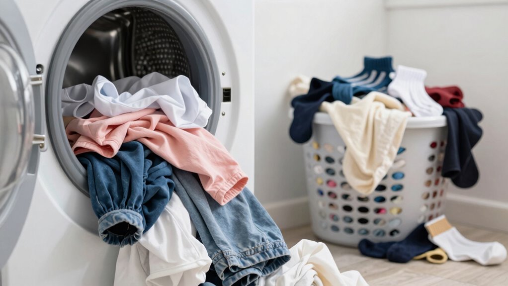 Using the wrong laundry setting can damage your clothes permanently by stressing delicate fabrics or causing shrinking. It also affects fabric care, leading to quicker wear and tear. Additionally, incorrect settings waste energy, reducing efficiency and increasing costs. Always select the right setting for your fabric type to safeguard your clothes, prolong their lifespan, and guarantee energy-efficient laundry routines that save you money and preserve fabric quality.