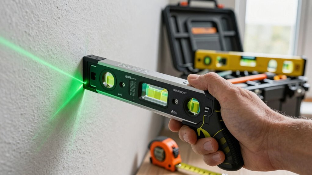 To calibrate your laser level, start by placing it on a stable surface and turning it on. Use calibration techniques like the two-point method: mark two points on a wall at a specific height, then measure the distance. Adjust the level until the laser line matches your marks. This guarantees laser accuracy. Don’t you just love the precision? Once calibrated, you can tackle any project with confidence, knowing your level’s spot on!