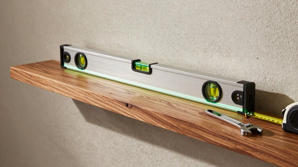 When you want to guarantee your shelves are perfectly level, mastering the use of a leveling tool is essential. Start by placing the level on the shelf, ensuring it touches both ends. Watch for the bubble to center between the lines; this indicates proper shelf alignment. If the bubble isn’t centered, adjust the shelf until it is. Employ these leveling techniques for best results: