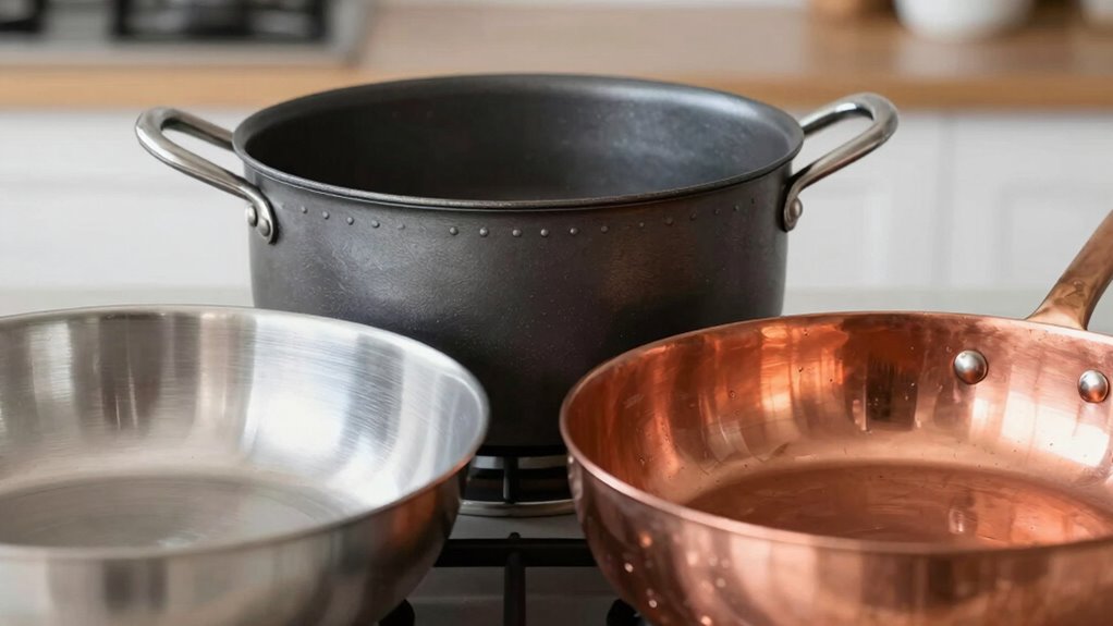 When choosing cookware, understanding aluminum, steel, and copper helps enhance your cooking. Aluminum is lightweight and heats quickly, but can react with acidic foods. Steel offers durability and even heat distribution, requiring regular maintenance. Copper excels in heat conductivity for precision cooking but needs frequent polishing. Each material has its pros and cons, impacting your cooking experience. Stick around to discover detailed insights on heat conductivity, maintenance tips, and how to choose the best cookware for your needs.