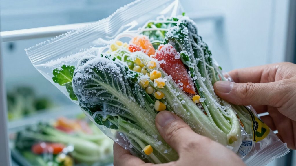 Fruits and vegetables, often considered the jewels of your freezer, can also fall victim to freezer burn. When you freeze fruits and veggies, moisture escapes, leading to a change in texture and flavor. Frozen fruits may lose their vibrant taste and become mushy, while vegetables can develop an undesirable, leathery feel. To prevent this, make certain to blanch vegetables before freezing to preserve their color and vegetable texture. For fruits, pack them into airtight containers or vacuum seal them to minimize air exposure. Always label your items with dates to guarantee you use them within a reasonable timeframe. By taking these steps, you can enjoy the best of your frozen fruits and vegetables without the unpleasant effects of freezer burn.