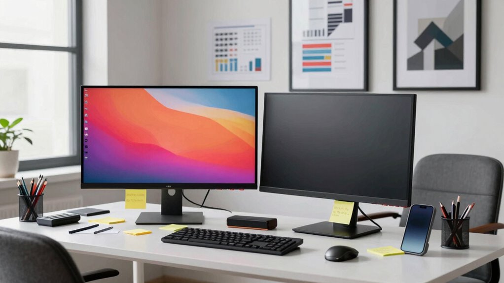 To maximize your productivity, ensuring color accuracy and calibration on your monitor is essential. Without proper calibration, colors can appear distorted, leading to mistakes in design and other tasks. You should regularly check your monitor’s color settings to maintain ideal color accuracy, especially if you work with graphics or images. Using a color calibration tool can help you achieve this by measuring your monitor’s output and adjusting it to industry standards. Don’t overlook the importance of this step; a well-calibrated monitor enhances your workflow and reduces eye strain. Spend a little time on color calibration, and you’ll see a big difference in the quality of your work and overall productivity.