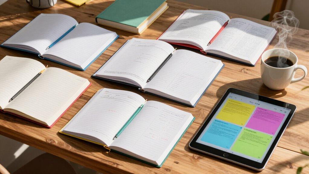 Choosing a note-taking system that works for you can boost your organization and retention. Consider your challenges, like messy notes or lack of visual cues. Handwriting promotes memory, but digital apps offer efficiency and easy access. A bullet journal can blend creative expression with structured planning. Reflect on your learning style—visual, auditory, or kinesthetic—and try different methods to find the best fit. There’s more to explore about effective strategies that could change your note-taking game.