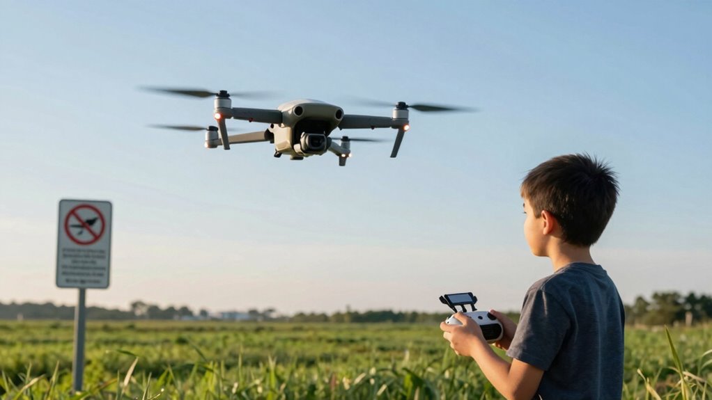You can’t fly a drone if you’re under 13 without adult supervision. Imagine a 12-year-old excitedly preparing for a birthday drone flight, only to learn about age restrictions. Legal requirements dictate that you must be at least 16 to operate drones commercially. For recreational use, while kids can fly with their parents, drone ownership becomes a shared responsibility. Always check local laws to guarantee compliance, as regulations can vary widely.