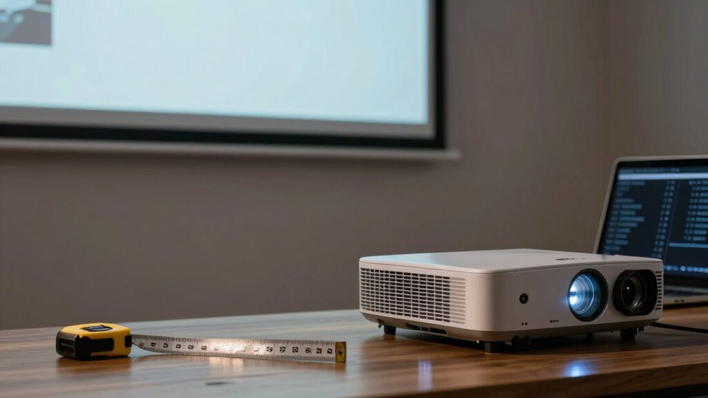 To guarantee you choose the perfect screen size for your projector setup, start by measuring your room accurately. First, determine your room dimensions—length, width, and height. This information helps you visualize the space and how a screen will fit within it. Next, consider the screen placement; it should be at an appropriate height for viewing comfort and aligned with your projector’s throw distance. Measure the distance from the projector to the wall or screen area to confirm you have enough space for a clear image. Don’t forget to account for any furniture or obstacles that might interfere with your setup. Additionally, understanding projector throw distance is essential to ensure the projected image fits your desired screen size and position. Properly calculating screen aspect ratio can also help you optimize your viewing experience and avoid image distortion. With these measurements in hand, you’ll be well-equipped to select the ideal screen size for your projector.