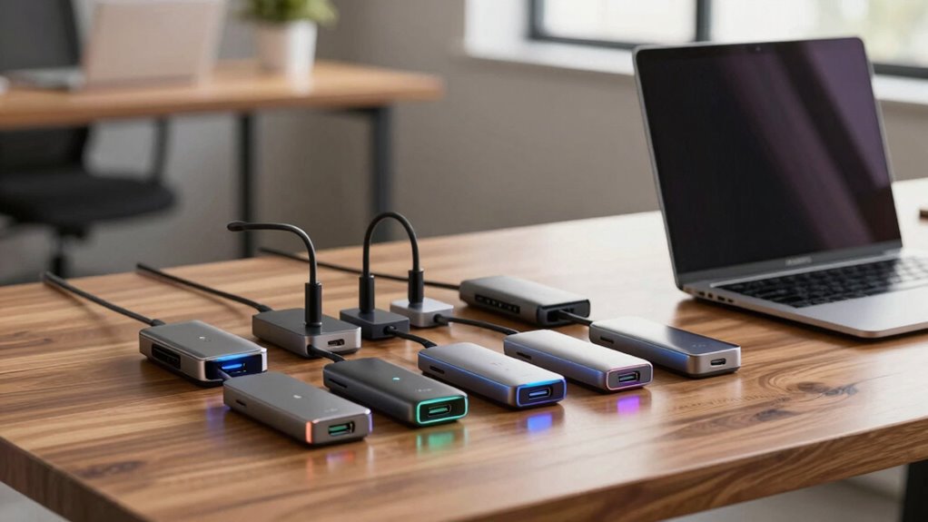 While evaluating USB-C docking stations, it’s important to take into account the variety of connectivity options they offer. I recommend looking for a mix of ports, including USB-A, USB-C, HDMI, DisplayPort, and VGA, to guarantee compatibility with all your devices. If you’re like me and value productivity, choose a dock that supports multiple display outputs for dual or triple monitors, ideally with 4K resolution. Having enough USB ports is vital, too; I prefer those with high-speed options like USB 3.0 or 3.1 for fast connections to keyboards, mice, and external drives. Don’t forget to check for extra features like Ethernet ports for stable internet access and SD/microSD card slots for easy data transfers from cameras.