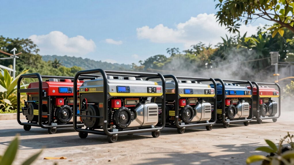 Understanding power output requirements sets the stage for evaluating fuel type flexibility in dual fuel generators. I appreciate that these generators allow me to choose between gasoline and propane, which is a game-changer. Gasoline usually delivers higher peak and running wattage, perfect for my heavy-demand needs. However, propane shines with cleaner emissions and can extend runtime per gallon, which I find beneficial during prolonged use. The ability to switch fuels enhances reliability, especially in emergencies when one source might run low. Plus, using both fuel types can improve my generator’s lifespan by preventing over-reliance on a single source. In my experience, this flexibility truly makes a difference in managing power efficiently.