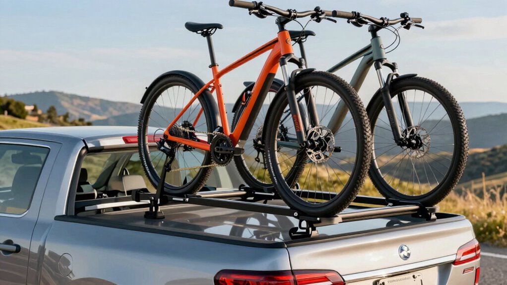 Finding the right e-bike hitch rack isn’t just about weight capacity; compatibility with different bike types plays a significant role, too. I always check that the rack accommodates various bikes, including standard, mountain, fat tire (up to 5 inches), and electric bikes. This versatility guarantees I can transport all my rides with ease. It’s essential to verify the rack supports different wheel sizes, typically between 20 to 29 inches, and appropriate wheelbase lengths, often up to 63 inches. I also look for adjustable tire holders or wheel straps to fit different styles securely. Finally, I confirm the rack is compatible with my vehicle’s hitch receiver size, usually a 2-inch receiver, for a safe and snug fit.