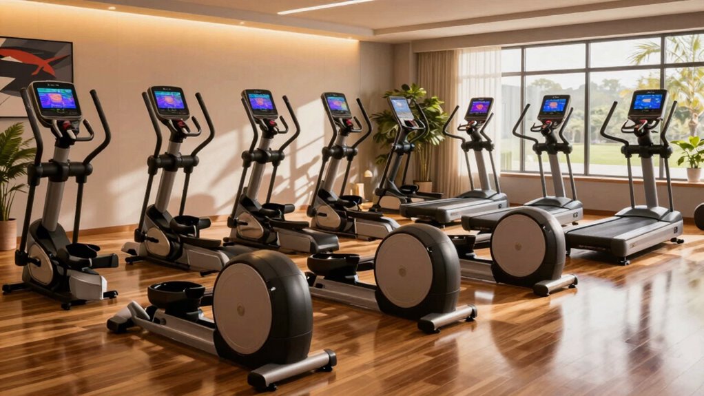 Monitoring features are essential for anyone serious about their fitness journey. I love how many elliptical machines come with LCD monitors that track key metrics like time, speed, distance, calories burned, and heart rate, giving me real-time feedback on my workouts. Some advanced models even integrate with fitness apps, letting me record and share my data for added motivation. Built-in heart rate grips help me manage workout intensity, making it easier to stay on track with my goals. Plus, programmable workouts and pre-set training programs let me vary my routine and target specific objectives effectively. With odometers tracking total distance traveled, I can set and achieve long-term fitness milestones, keeping my progress in clear view.