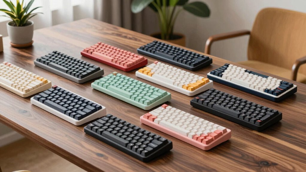 While exploring ergonomic split keyboards, the key switch mechanism stands out as an essential factor that can greatly impact my typing comfort. I’ve found that low-force switches considerably reduce finger fatigue during long typing sessions. Mechanical switches, like Kailh or Cherry MX, offer tactile feedback that enhances my accuracy and satisfaction compared to membrane switches. I appreciate keyboards with adjustable activation forces, allowing me to customize the experience to minimize strain. Scissor-switch or dome-switch mechanisms provide a quieter typing experience while still delivering feedback. Additionally, I prioritize durability; high-quality key switches can handle millions of keystrokes, ensuring my keyboard remains reliable and performs consistently over time. Choosing the right switch mechanism is key to enhancing my overall typing experience.