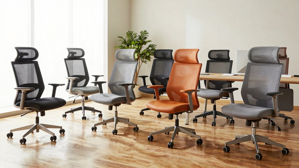 When it comes to selecting an ergonomic office chair, the materials used play an essential role in both durability and comfort. I’ve found that high-quality components like breathable mesh and high-density foam not only enhance the chair’s longevity but also guarantee you stay comfortable during long hours of work. Chairs with BIFMA-certified components and stainless steel frames support substantial weight capacities, often between 250 to 400 pounds, without sacrificing stability. Breathable mesh backrests allow airflow, reducing heat and sweat, which is a game changer. Plus, high-density foam cushions maintain their shape, preventing sagging. Finally, adjustable lumbar support made from robust materials is vital for proper spinal alignment, reducing strain and improving posture throughout your workday.