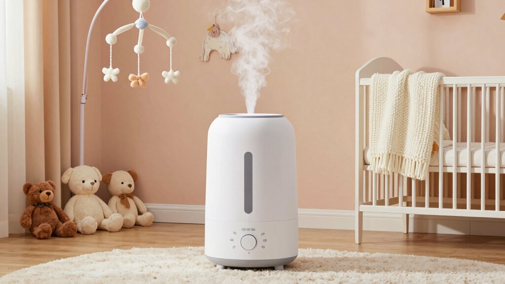 Oh, absolutely, because nothing says “sweet dreams” like a whiff of eucalyptus or lavender wafting through your baby’s nursery, right? Wrong. I wouldn’t recommend using essential oils in nursery humidifiers unless you want to turn your little one’s room into a fragrant science experiment. Most humidifiers aren’t designed for oils, and they can cause mold or damage. Stick to plain water for a safer, calmer sleep environment.