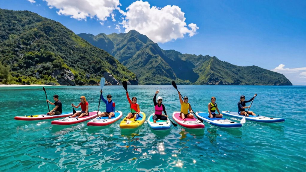 When it comes to inflatable paddle boards, the right accessories can make all the difference in your paddling experience. I always recommend checking for adjustable paddles, high-quality pumps, safety leashes, and backpacks. A good pump can inflate your board in under 10 minutes, saving precious time for adventure. A complete accessory kit should also include removable fins, repair kits, and waterproof bags for safety and convenience. Additionally, look for boards with D-rings for securing gear or attaching kayak seats, which adds versatility. A premium travel backpack is essential for hassle-free transportation, ensuring you’re ready to hit the water wherever you go. The right accessories truly enhance your overall enjoyment and readiness for every paddling journey.