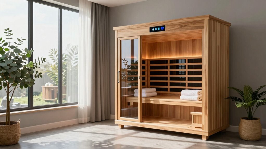 Choosing the right size for your infrared sauna sets the stage for your overall experience, but the heating technology it employs is just as important. I’ve found that carbon crystal panels heat up faster and are more energy-efficient compared to ceramic ones, making them a great choice if you’re looking for quick results. If you’re health-conscious, opting for low EMF technology helps minimize exposure to electromagnetic radiation. The heating capacity typically ranges from 900 to 1200 watts, directly affecting how quickly you reach your desired temperature, usually between 120°F and 140°F. Some saunas even combine infrared and steam technologies, offering enhanced detoxification and relaxation benefits. Customizable temperature settings allow you to tailor the experience to your comfort and health needs.