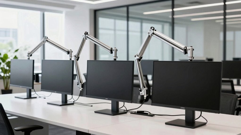 When selecting a heavy-duty monitor arm with a gas spring, it’s essential to take into account the installation method because it directly affects stability and compatibility with your desk. Most gas spring arms offer both C-clamp and grommet mounting options, providing flexibility for different desk types. Clamps work well on desks 0.39 to 3.54 inches thick, while grommet mounts suit desks 0.39 to 2 inches thick, depending on the model. Proper installation involves measuring your desk’s thickness and choosing the compatible method to guarantee stability. Some arms include quick-release VESA plates, making monitor attachment easier. Always follow the manufacturer’s instructions regarding mounting hardware and torque specifications to guarantee a secure, durable setup that can handle the arm’s heavy-duty support.