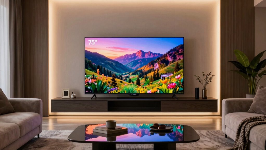 Choosing the right display technology for a 75-inch QLED TV can feel overwhelming, especially with so many options available. I’ve found that QLED technology, utilizing quantum dots, delivers vibrant colors and impressive brightness, which really enhances picture quality. Mini LED backlighting further elevates the viewing experience by providing precise control over local dimming zones, resulting in deeper blacks and brighter highlights. This improves the contrast ratio considerably. When looking for HDR support, I appreciate how it expands the color and brightness range, bringing more detail to the screen. Additionally, higher refresh rates like 120Hz or 144Hz guarantee smooth motion during action scenes, and advanced processing technologies upscale lower resolution content to near 4K, enhancing clarity and detail.