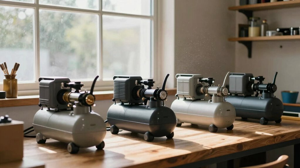 Choosing a quiet air compressor that suits various applications can be a game changer for your projects. I’ve found that a versatile compressor should handle tools like nailers, airbrushes, and inflators, making it ideal for woodworking, automotive repair, and even sports equipment inflation. Pay attention to the airflow and pressure specs, like CFM ratings at different PSI levels, to guarantee it powers your tools effectively. A lightweight and portable design is essential, so you can move it easily between work sites. An oil-free design not only means maintenance-free operation but also delivers cleaner air for sensitive tasks. Finally, good recovery times and tank capacities are key for uninterrupted use, whether you’re indoors or outdoors.