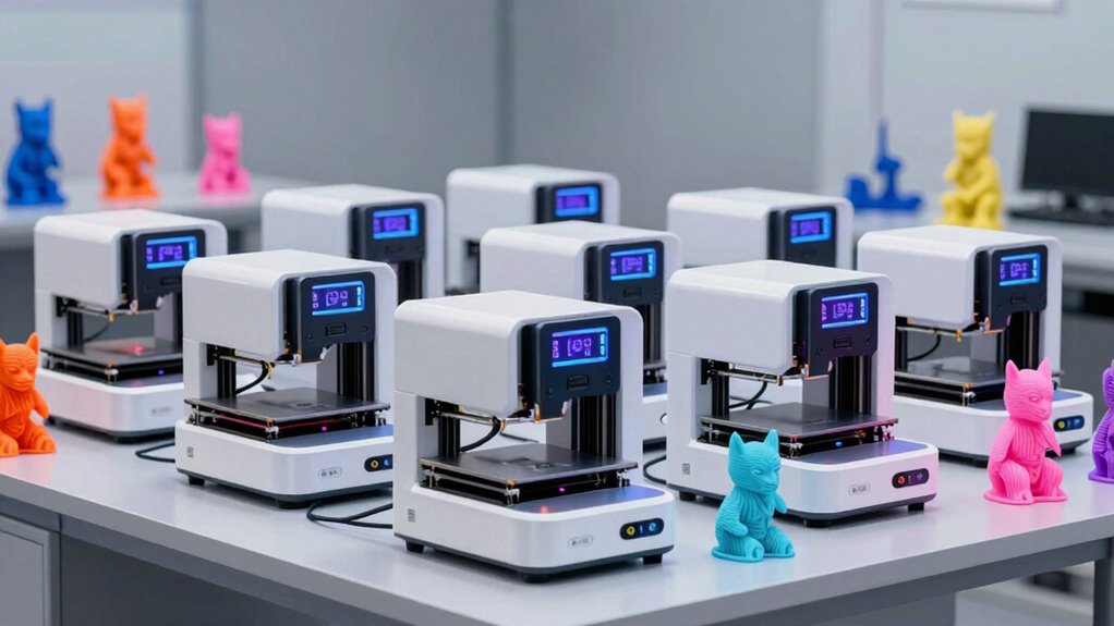 User-friendly features make the 3D printing experience smoother, but temperature control efficiency is another key factor that can’t be overlooked. Effective temperature management guarantees ideal resin viscosity, enhancing layer adhesion and minimizing print defects like bubbles and layer separation. Some printers even have dynamic temperature adjustment mechanisms, which are especially beneficial in colder environments. This consistency greatly impacts the curing process, guaranteeing even light exposure and reducing inconsistencies. High-quality models often include heated resin vats, keeping the resin at a perfect temperature for improved fluidity. By maintaining a stable temperature during printing, I’ve noticed smoother surface finishes and higher overall print quality, minimizing the appearance of layer lines and imperfections. It truly makes a difference in the final output!