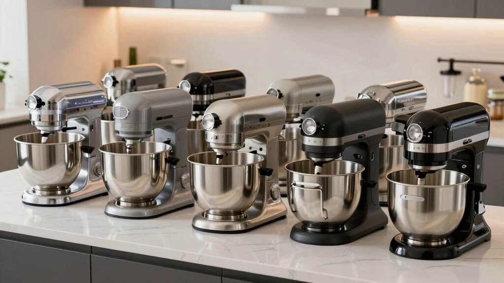 If you’re searching for the 13 best stand mixers for bread dough in 2026, I’ve tested top models with powerful motors, large bowls, and versatile attachments. Whether you prefer a tilt-head design or a sturdy commercial-grade mixer, there’s an option to match your baking needs. I’ll guide you through features like capacity, stability, and noise levels to help you pick the right one. Keep going to discover more about these excellent mixers.
