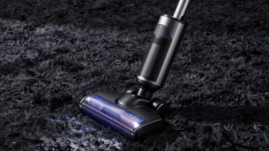 A powerful, motorized brushroll with high RPMs is vital for effectively cleaning thick carpets because it agitates dense fibers and dislodges embedded dirt and pet hair. The effectiveness of the brushroll also hinges on bristle type and length; stiff bristles are better for deep cleaning dense carpets. An adjustable brushroll height or automatic height adjustment guarantees ideal contact, maximizing cleaning performance. Additionally, a brushroll shutoff switch offers versatility, allowing you to switch between deep carpet cleaning and gentle bare floor care. Regular maintenance, like cleaning and replacing the brushroll, is essential to keep it functioning at peak performance over time. Choosing a vacuum with these features ensures thorough cleaning of thick carpets while maintaining longevity and versatility.
