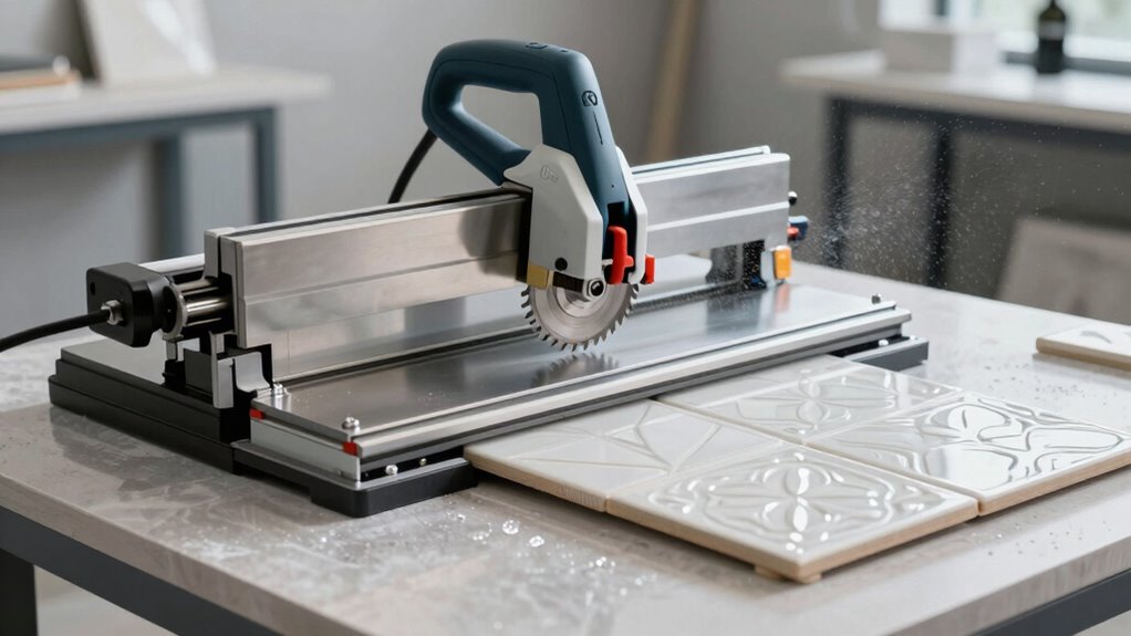 Have you considered how the size and capacity of a wet tile saw impact your ability to complete your porcelain tile project efficiently? A saw with at least an 18-inch maximum cut length is ideal for handling diagonal cuts on larger tiles. Make sure the maximum cutting depth of 1-2 inches matches your tile thickness to avoid issues. The bevel capacity should allow for up to 45-degree angled cuts, essential for complex patterns. Additionally, check that the worktable is large enough to support bigger porcelain slabs comfortably. Versatility matters too—ensure the saw can make rip cuts and crosscuts on various tile sizes. Choosing a saw with the right cutting capacity ensures smoother, more precise cuts and minimizes the need for multiple tools or adjustments during your project.